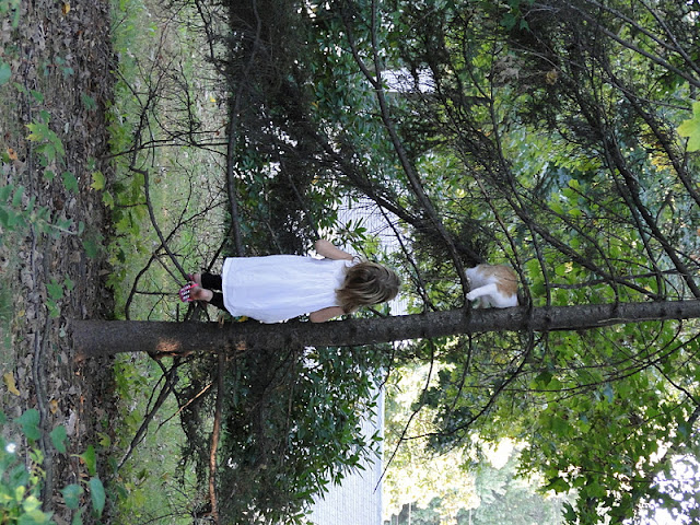 Lately, Liliana can be found way in the back trying to climb this tree. The cat here is Sunny, our neighbor's kitten that has recently been made a part-time outdoor cat... he spends lots of his time in our yard and is super friendly and sweet! We all love having him around.